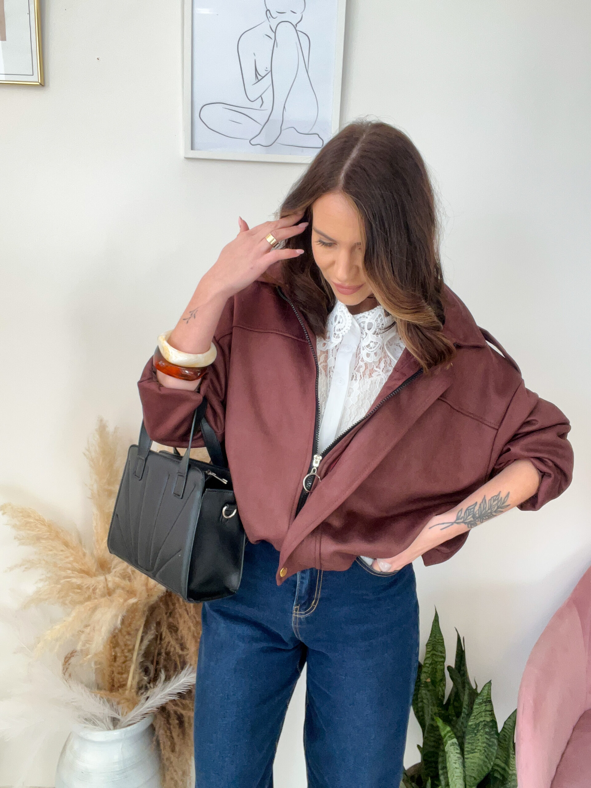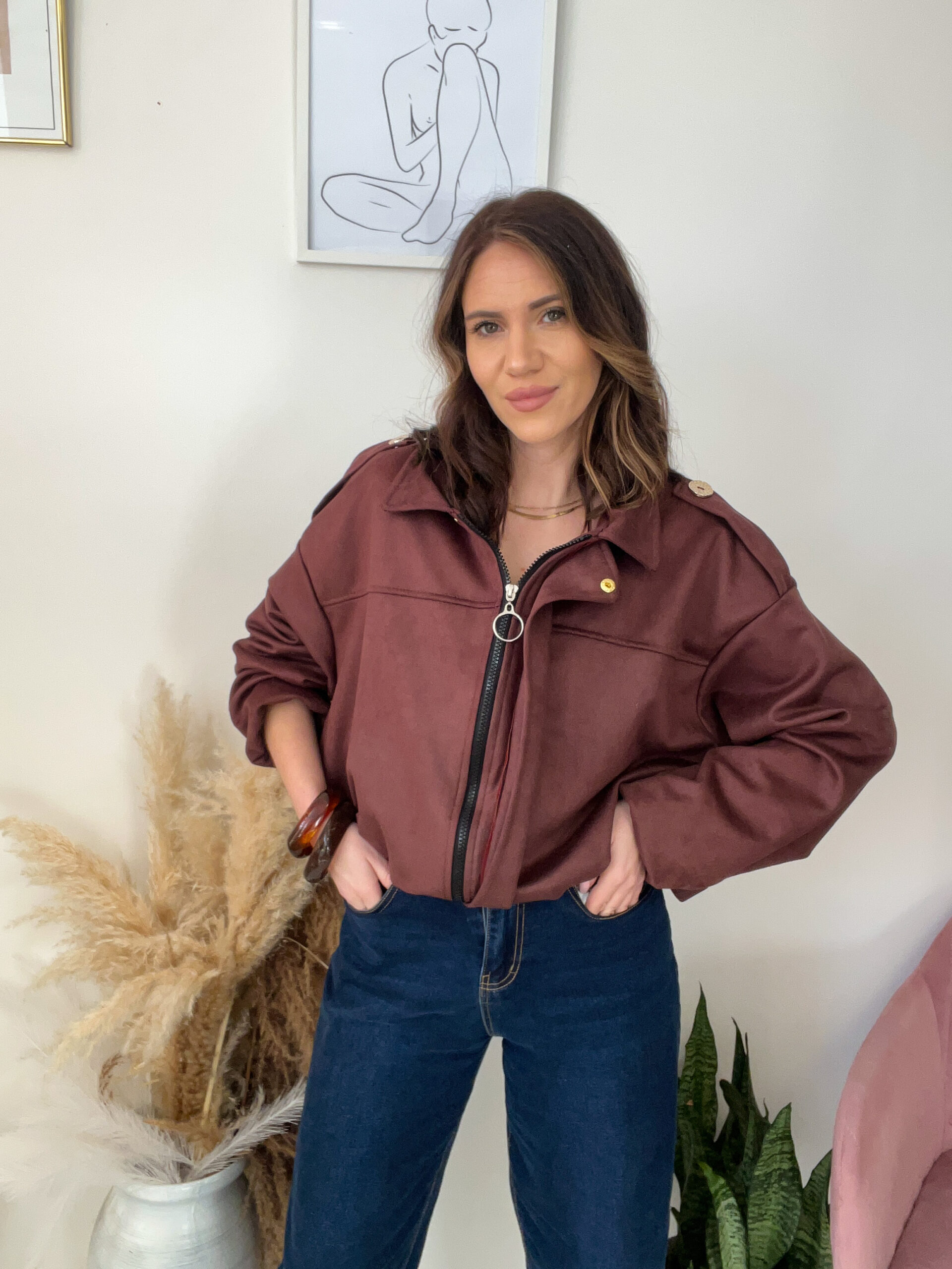 Ta kurtka ma piękny, głęboki odcień brązu, świetnie układa się na sylwetce i robi cały outfit nawet do najprostszych jeansów.