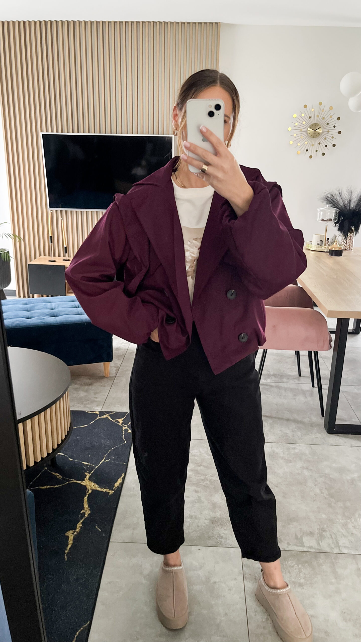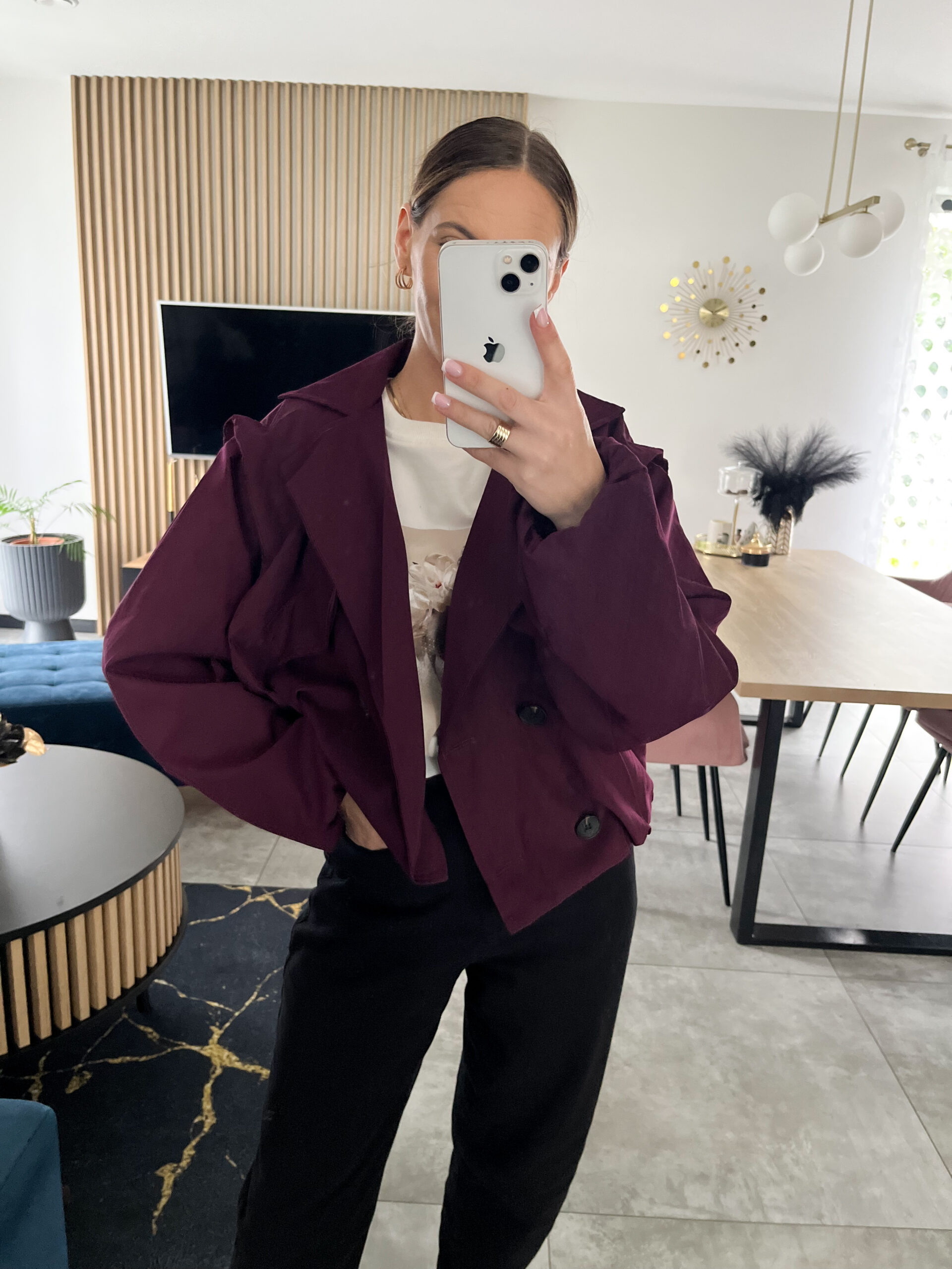 Luźny, oversize’owy krój gwarantuje komfort noszenia i swobodę ruchów, a podwójne zapięcie na guziki dodaje jej charakteru.Model o krótszym fasonie pięknie podkreśla talię i świetnie komponuje się zarówno z jeansami, jak i eleganckimi spodniami