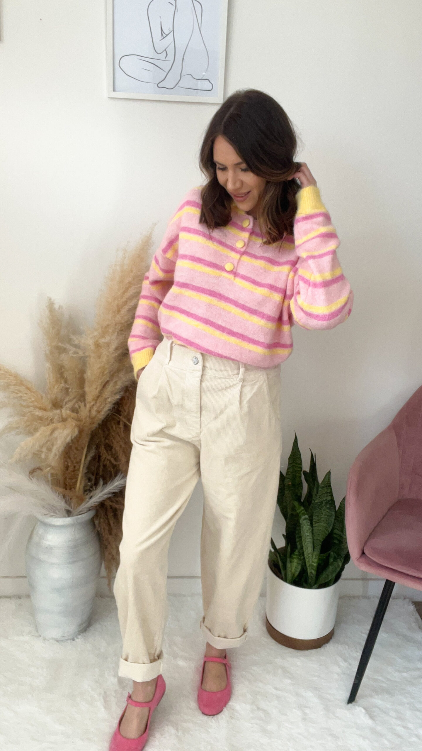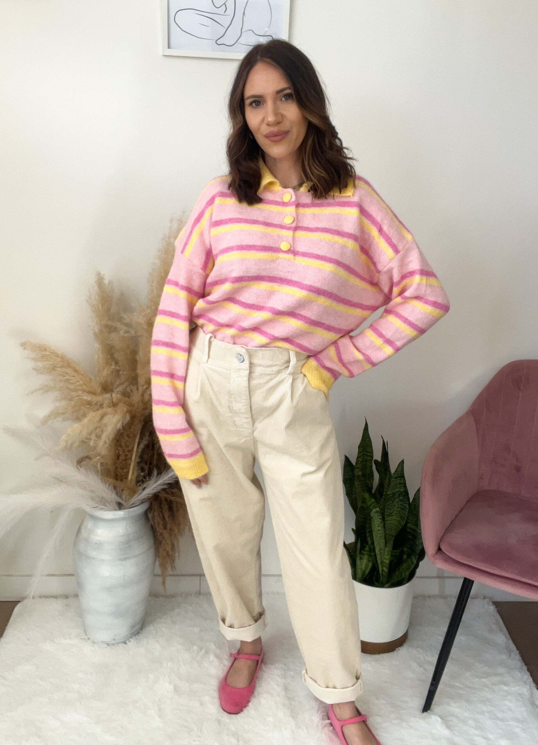 Pastelowe paski w różu i żółci wyglądają przepięknie, a kołnierzyk i guziczki dodają mu uroku w stylu „preppy” ✨
